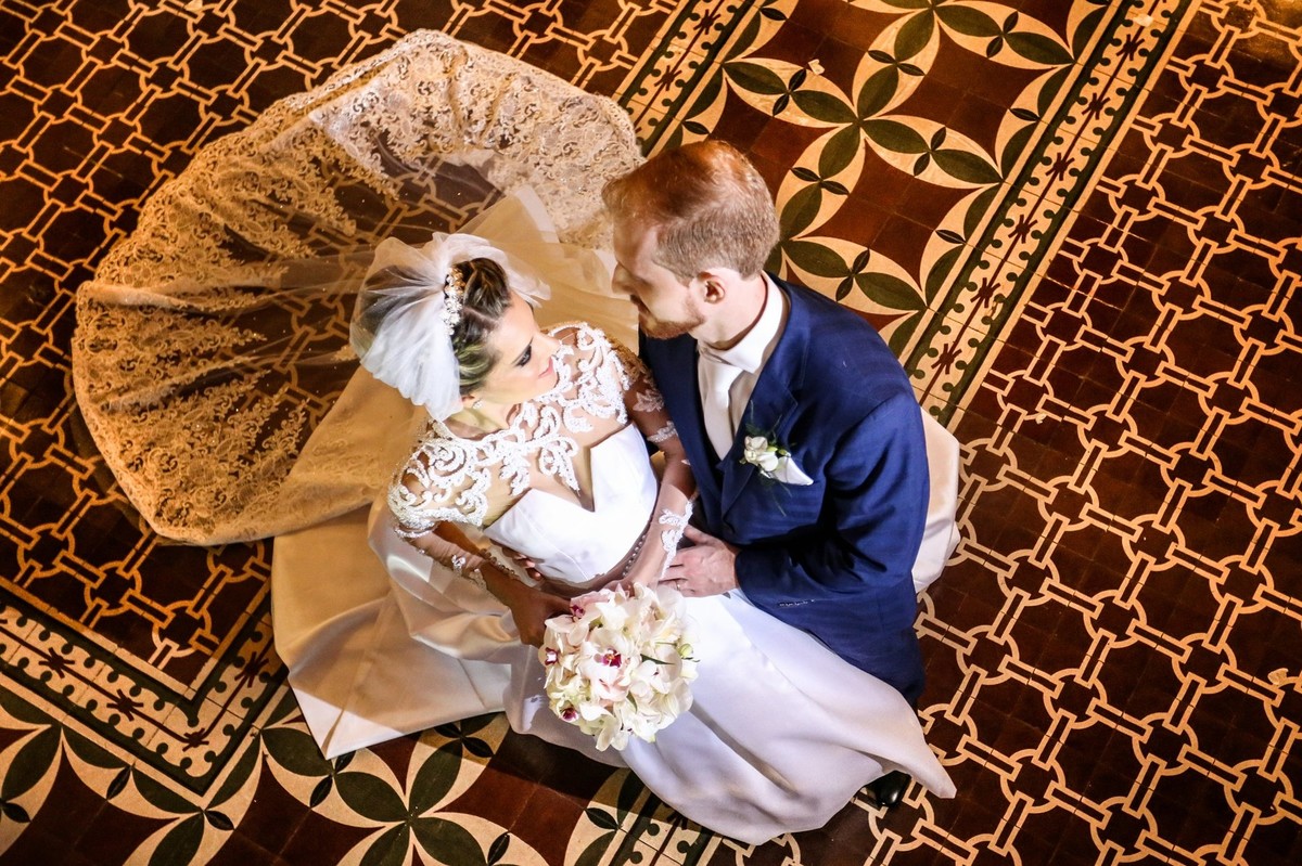 noivos olhando um ´pro outro e noiva mostrando detalhes do seu vestido na igreja do bom despacho foto tirada nas lentes do fotografo thiago alt